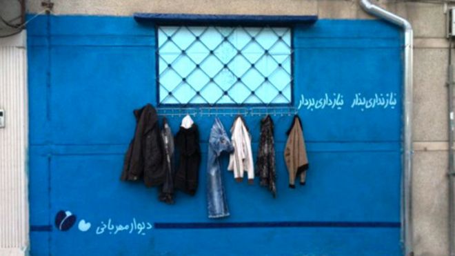 نوشته روی این دیوار آبیرنگ از مردم میخواهد لباسهایی را که نمیخواهند آن جا بگذارند تا کسانی که نیاز دارند آن را بردارند.